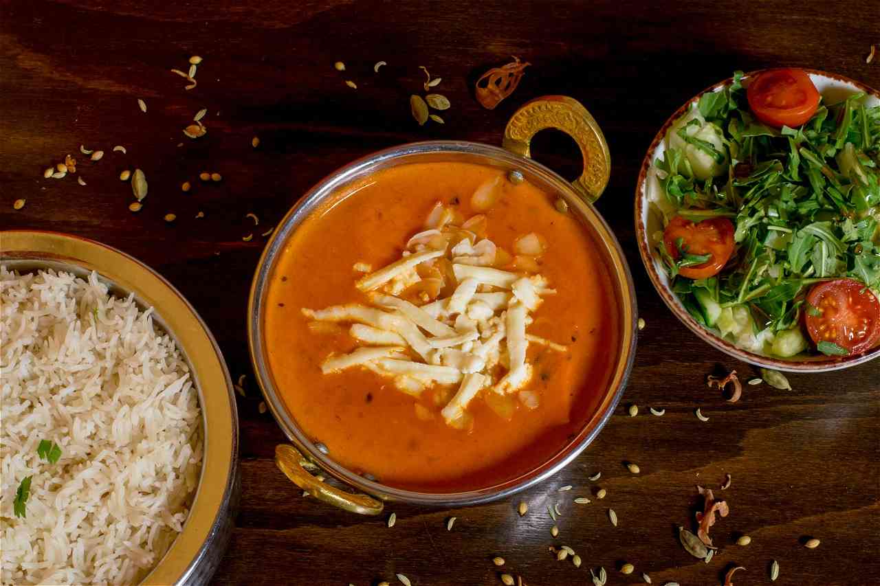 Indischer Rahmkäse zubereitet in einer cremig-sahnigen Tomaten-Currysoße, garniert mit Mandelblättchen.