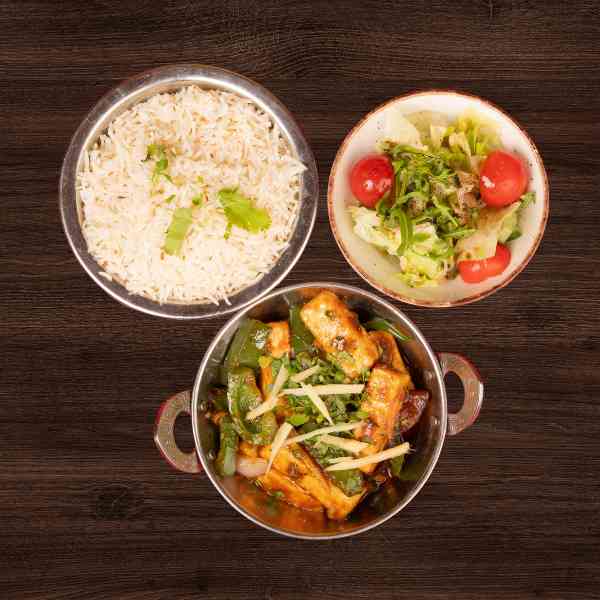 Weiche marinierte Paneerwürfel, geschwenkt mit bunten Paprikaschoten, Zwiebeln und frischen grünen Chilischoten, im Wok gebraten in einer kräftigen, würzig-scharfen Sauce.