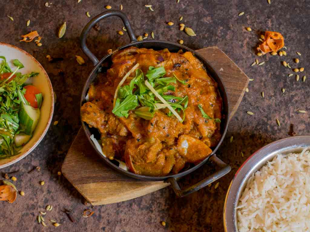 Zarte Lammstücke, geschmort mit karamellisierten Zwiebeln, Tomaten und traditionellen indischen Gewürzen – sanft angebraten für eine reichhaltige, aromatische Sauce.