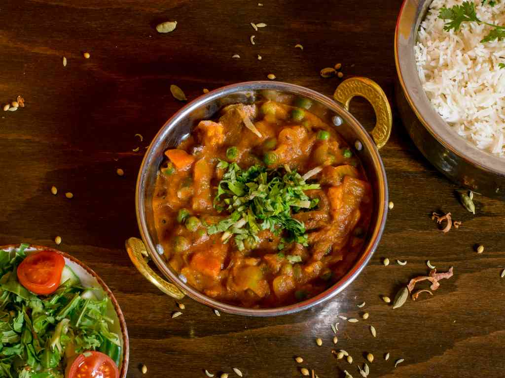 Gemüse-Mix aus Erbsen, Champignons, frischen Tomaten und Zwiebeln in einer würzigen Currysauce.