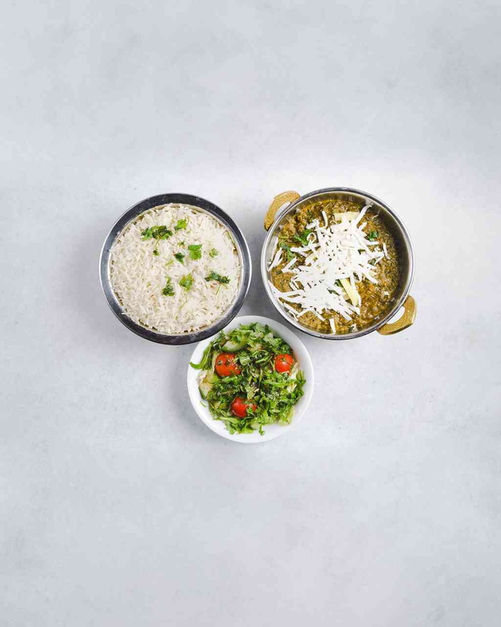 Indischer Rahmkäse zubereitet in einer cremigen Soße und feinen getrockneten Gewürzen, darunter Blättchen des Bockshornklees.