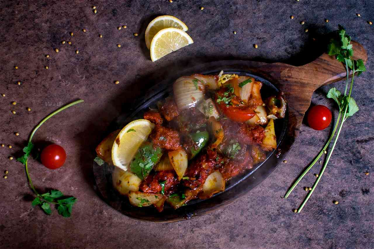 Im Lehmofen gegartes Hähnchenhack, mit Kräutern verfeinert und zusammen mit frischen Tomaten, Paprika, Ingwer und Zwiebeln in einer pikant-scharfen Gewürzpaste zubereitet.