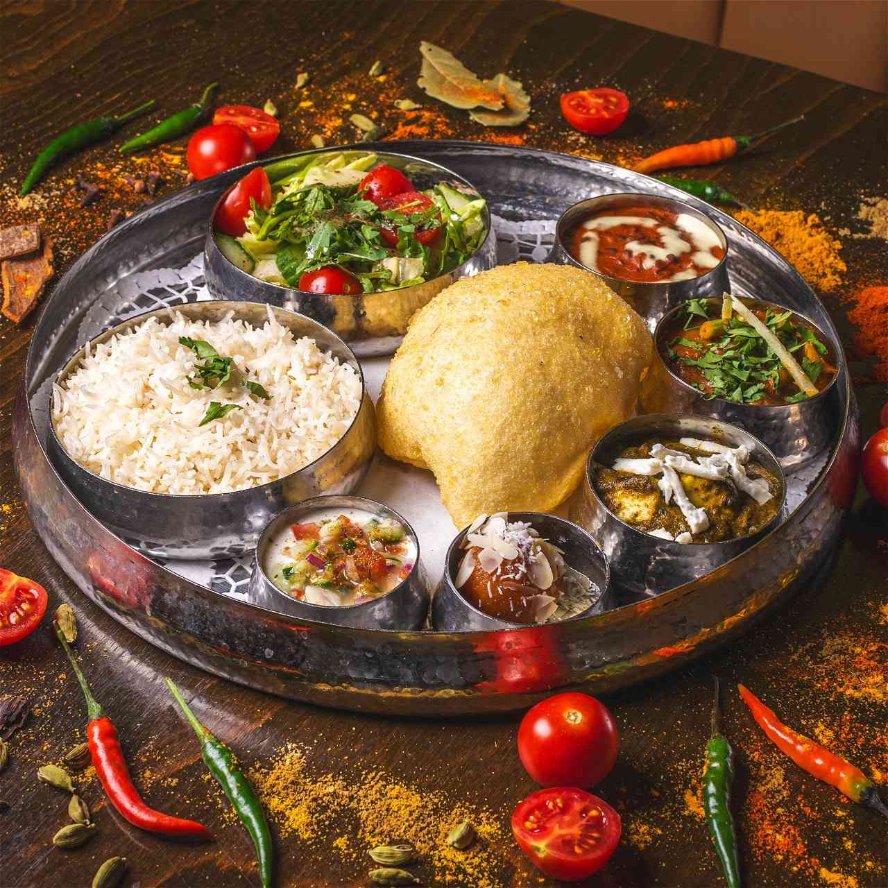 Gemischte Platte aus Palak Paneer, Dal Makhani und Amritsari Chole, serviert mit Basmatireis, Butter Naan, Joghurt und süßem Gulab Jamun.